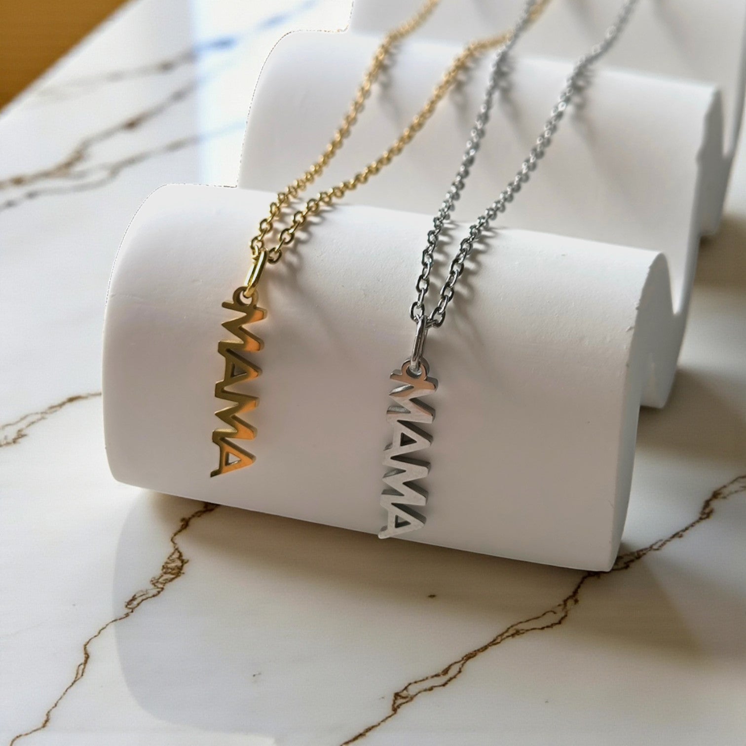 Zarte Halskette mit Anhänger „Mama“ – Ausdruck der stärksten und bedingungslosen Verbundenheit. Geeignet sowohl als Geschenk für die geliebte Mutter als auch für Mütter selbst, die diese besondere Inschrift nah am Herzen tragen möchten. Ein Symbol der Liebe, Dankbarkeit und Zärtlichkeit.