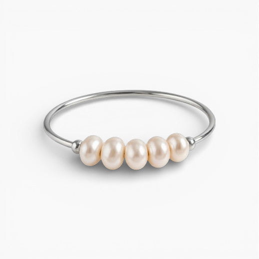 Ein eleganter Ring, verziert mit fünf natürlichen Süßwasserperlen. Eine Kombination aus Minimalismus und Klasse, die ein Gefühl von Zärtlichkeit und Weiblichkeit vermittelt. Die Perlen sind natürlich, was jeden Ring einzigartig macht.