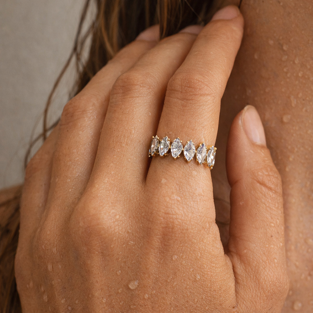 Пръстен „Шарлот“ впечатлява с изящна линия от блестящи цирконии, подредени като корона около пръста. Дизайнът е едновременно модерен и луксозен – създаден да улавя светлината при всяко движение и да придава елегантен акцент както на ежедневна, така и на вечерна визия.